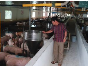 Ông Hoàng Đình Quê kiểm tra sức khỏe đàn lợn trong trang trại.