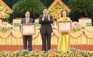 Bí thư Tỉnh uỷ Nguyễn Hồng Thái trao Bằng khen của Thủ tướng Chính phủ cho các đồng chí: Đào Duy Hữu, Phó Chủ tịch Hội Nông dân tỉnh; Phan Thị Thu Hiền, Phó Trưởng Ban Công tác nông dân.