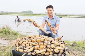 Anh Nguyễn Văn Hợi – Giám đốc HTX Thương mại dịch vụ nông nghiệp Bảo Ngọc bên những củ sen tươi vừa thu hoạch.